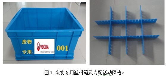 (2)瓶装化学废弃物:应确保密封,避免泄漏,并竖立放置在蓝色的废物专用塑料箱内,用网格隔开(见图1)。