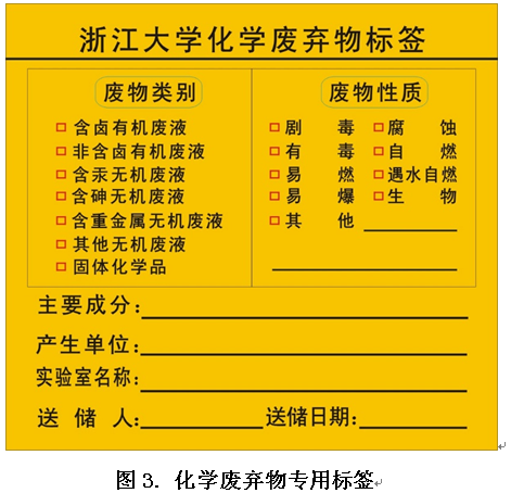 2.各单位送往收集点的化学废弃物(空瓶除外)必须张贴《化学废弃物专用标签》(见图3,可到后勤集团技术物资供应中心领购),填写《浙江大学化学实验废弃物登记表》(一式三份)(见附件1,可从后勤管理处网页下载),并确保容器密闭、不破损、不泄漏。其中,对于含卤素的有机废液、含一般重金属的无机废液、含汞的无机废液、含砷的无机废液这四类化学废弃物应单独收集,不可与其它物质混存;对于含甲类危险化学品(名录见附件2)的废物除了需在标签右上角注明“甲”的字样,在送处时需送到收集点甲类废物的区域。对未达到要求的废弃物,收集点工作人员根据合同不予接收。