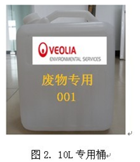(3)10L专用桶收集的化学液体废弃物:装载不得过满(不得超过桶上的Max线),如需混装,应避免发生剧烈反应(见图2)。如仍需50L(原收集桶)的请按表1联系方式索取。