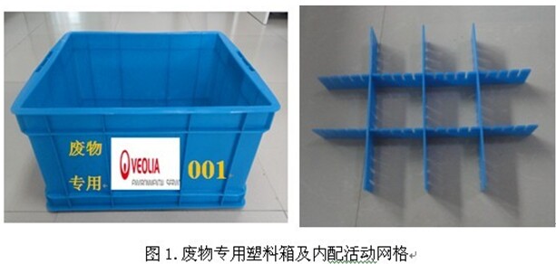 (2)瓶装化学废弃物:应确保密封,避免泄漏,并竖立放置在蓝色的废物专用塑料箱内,用网格隔开(见图1)。