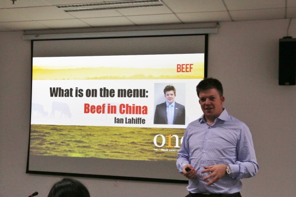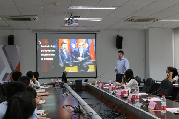随后,重量级嘉宾,奥特奇销售总监和新业务发展总经理陆羽安为我们做主题为《肉牛在中国的发展现状》的演讲报告。在报告中,他与我们分享了自己的职业生涯,并为我们将来的人生规划提出了中肯的建议,他还为我们分析了肉牛的市场前景及其在中国的发展方向,让同学们受益匪浅。