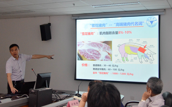 (图为生猪养殖首席专家汪以真教授汇报项目进展)