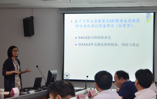 (图为生物兽药首席专家杜爱芳教授汇报项目进展)