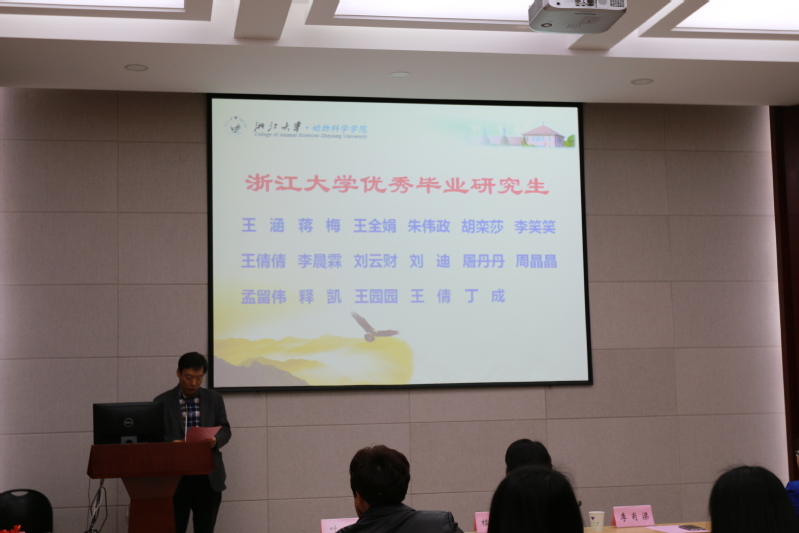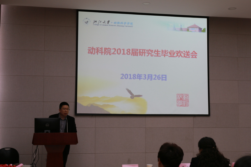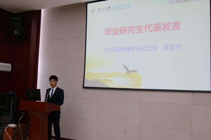 接着,2015级养殖专业硕士生孟留伟作为毕业研究生代表发言,他代表即将毕业的2018届全体研究生向学院领导及老师致以最衷心的感谢!孟留伟在发言中回顾了自己的研究生历程,他认为研究生一定要牢记“求是,创新”的校训和“厚德博学,慎思敦行”的院训,并以此激励我们今后的学习、生活和工作朝更好的方向发展。毕业不是终点,而是新的起点,无论身处何方,在浙江大学收获的师生情和同学情都是人生中最珍贵的财富。