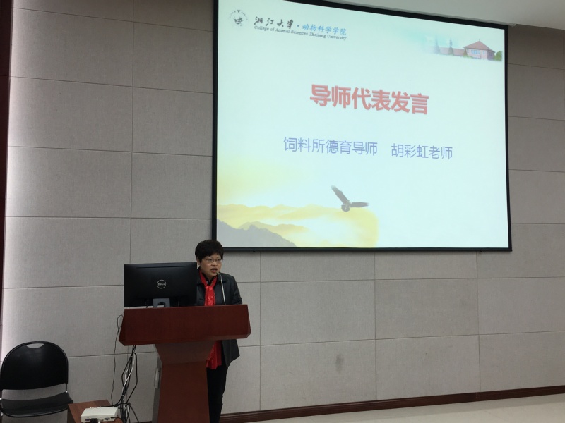 2015级饲料所硕士班德育导师胡彩虹作为导师代表进行发言,她讲到现在是同学们“最快乐、最兴奋、最纠结”的时刻,graduate不是完成和结束,而是开始和进步。她强调,学院在研究生培养过程中始终把品德修养、知识学习、能力提升和学术创新作为第一要务,考虑到每一个学生的个性发展,力求挖掘每一个学生的才华和潜力。她用“位置决定影响,脚步决定空间,高度决定视野,平台决定未来”这句话表达了对毕业研究生们的殷切期望,并代表全院师生祝福毕业研究生一帆风顺,一生幸福,常回家看看。