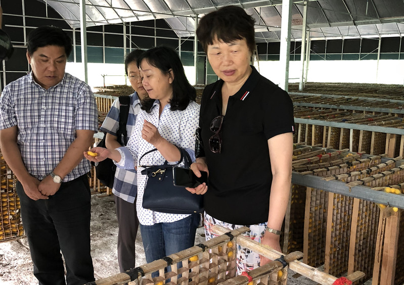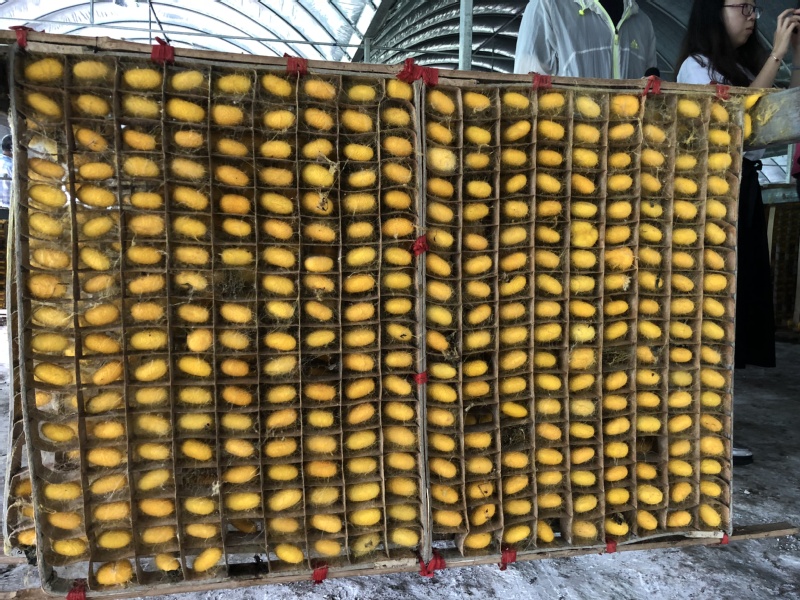 28日下午,参会代表现场参观了永康市舟山镇碧湍里彩色茧品种示范推广基地与永康市土特产公司彩色茧、丝与产品展示厅。代表们详细考察了示范基地“金秋´初日”品种的金黄色鲜茧,就其抗病能力、产量、茧质、成色等方面进行了全面了解。