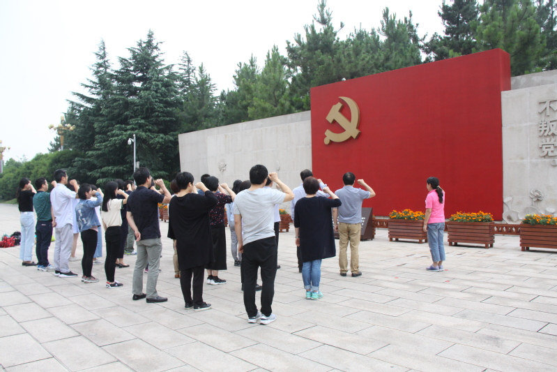 在纪念馆宣誓墙鲜红的党旗下,全体党员面对党旗,庄严地举起右手,在党委书记楼建悦的领誓下,重温了入党誓词,“我志愿加入中国共产党,拥护党的纲领,遵守党的章程,履行党员义务……永不叛党。”