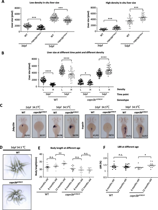 该研究主要关注半胱氨酸钙蛋白酶3(Capn3,在斑马鱼中该基因被命名为Capn3b),并制备了敲除Capn3b的斑马鱼模型。虽然敲除Capn3b的斑马鱼可以稳定生存和繁殖,但在一些应激状态比如不同密度、不同温度的饲养条件下,敲除Capn3b的胚胎发育是受影响的,表现为身体呈弧形、生长迟缓、肝体比(用于评估肝脏再生的指标)比例失调 (Figure 2)。