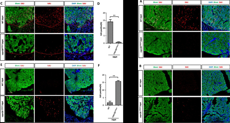 当将Capn3b敲除斑马鱼肝脏腹侧叶摘除后,一开始其肝脏再生速度远远低于野生型,无论是切除区域和深层区域的细胞增殖能力均远远弱于野生型;而当野生型肝脏再生基本完成时,同时期的Capn3b敲除肝脏切除区域的细胞才开始启动再生机制,而深层区域的细胞DNA复制水平仍然很低。这说明在Capn3b敲除的肝脏细胞中,细胞周期再进入不仅延迟,而且并未同步化(Figure 3C-F,Figure 4)。