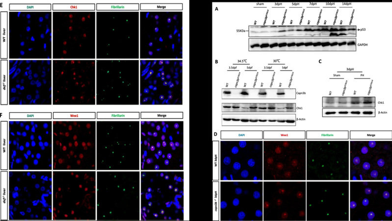 通过提取野生型未处理、野生型肝脏腹侧叶摘除、Capn3b敲除型未处理、Capn3b敲除型肝脏腹侧叶摘除这四组肝脏细胞的核蛋白,并进行了质谱分析,找到了许多与核仁RNA功能相关的差异蛋白。除此之外,团队鉴定出G2-M检查点蛋白激素Wee1和上游调节因子Chk1均存在与Capn3b存在相互作用的区域,且这些相互作用区域从斑马鱼到人是高度保守的。初步推断Wee1和Chk1与Capn3b在核仁中能够形成复合体。随后进一步发现,当肝叶被摘除后,Wee1和Chk1在Capn3b敲除型肝脏组织中大量堆积。这可能是Capn3b敲除引起肝再生延迟的原因之一(Figure 8E-F,Figure 9)。