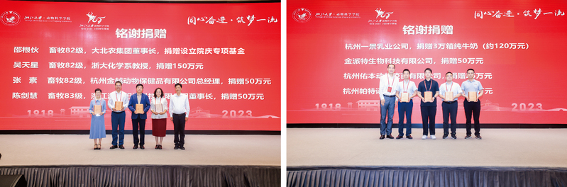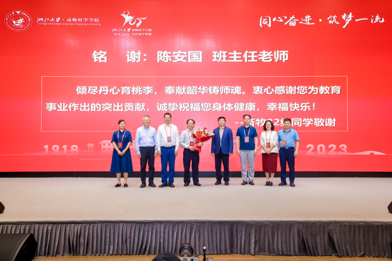 悠悠寸草心,报得三春晖。大会特别设置了感恩环节,畜牧82班校友代表向班主任陈安国老师赠送铭谢牌和献花,会场洋溢着浓浓的师生情。大北农集团董事长邵根伙校友,浙江大学化学系教授吴天星校友,杭州金越动物保健品有限公司总经理张素校友,浙江浙大阳光科技有限公司董事长陈剑慧校友,浙江一景乳业股份有限公司,金派特生物科技有限公司,杭州佑本动物疫苗有限公司,杭州帕特诺尔宠物有限公司向学院捐赠,为高质量发展注入新力量。学院向十余项基金捐赠单位和校友颁发铭谢牌,师生代表深情朗诵动科学院赋词《春华秋实》。