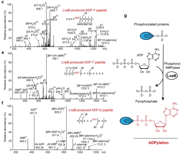 图3. LnaB对磷酸化多肽催化腺苷酸化并产生ADPylation修饰。
