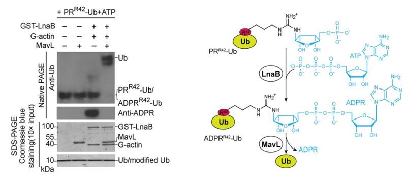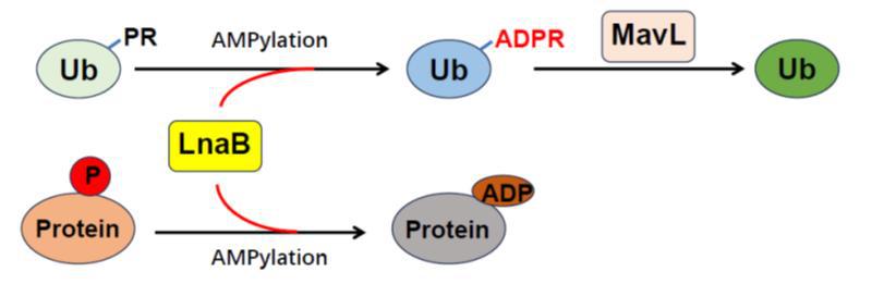 为了验证嗜肺军团菌是否存在特殊的效应蛋白消除PRR42-Ub、或者对泛素进行其他修饰,该研究建立了独特体外和体内筛选体系,发现其效应蛋白LnaB是一个独特的AMPylase(腺苷酸化酶),以ATP作为配体,以宿主肌动蛋白(actin)作为激活剂,对PRR42-Ub的磷酰基催化单磷酸腺苷酸化(AMPylation)修饰,从而生成ADPRR42-Ub。生成的ADPRR42-Ub进一步由效应蛋白MavL水解成为Ub。这个由LnaB和MavL催化形成的级联反应,实现了对非经典泛素化过程的逆转(图2),从而保护了对嗜肺军团菌胞内生存和宿主细胞正常生理过程都至关重要的经典泛素化通路。