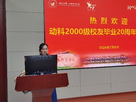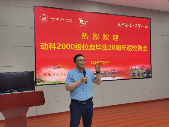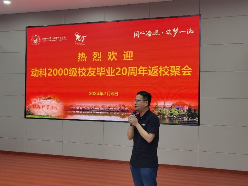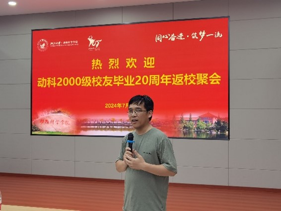 院系座谈交流会上,学院党委委员、2000级校友代表郑火青教授主持会议,学院副院长单体中教授代表学院向2000级校友返校聚会表示热烈欢迎,向校友们汇报了学院近年来在教育教学、科学研究、师资队伍、学科建设、思政引领等方面取得可喜可贺的成就。动物科学系张坤主任、动物医学系谭勋主任和特种经济动物科学系黄凌霞副主任分别向各位校友简要介绍各系及各自专业的发展情况。动物科学系与畜牧学科在凝练研究方向、创新团队建设等方面实现协同发展;动物医学系、动物医学中心和教学动物医院相辅相成、共同进步;特种经济动物科学系在国家重点学科和学术创新、育人标兵领衔与教书育人等可喜成果。学院锐意进取的风貌、蓬勃向上的发展让校友们印象深刻,深受鼓舞。动物科学系原主任陈安国教授、任课教师徐宁迎教授应邀参会。校友代表钱磊和朱高风同学分享毕业后20年的工作和生活的经历与感悟。最后,动医002班同学手拿珍藏了20多年的学生证合影留念,追忆同学时光。