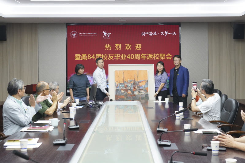 金佩华简要回顾了蚕桑80班级大学期间的学习生活,唤起了同学们的美好记忆。他对同学们能相聚杭州,重温四十年同窗友谊表示感谢。金佩华代表全班同学向母院表达培育之恩,并衷心祝愿母院能更好更快更高质量的发展,建设一流学院和一流学科。最后,班长周国程校友和画家王亚芳校友向母院赠送她亲自创作的一幅油画作品《温暖的港湾》,代表蚕桑80班级全体同学共同的心声“母院是我们温暖的港湾”。
