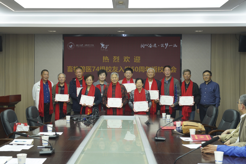座谈会上,单体中、张坤、谭勋、屠友金四位老师为畜牧兽医74级1班2班校友们一一颁发了入学50周年荣誉证书,并祝福各位校友身体健康、阖家幸福。