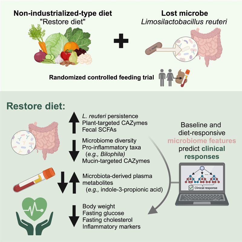 在现代社会,工业化生活方式,尤其是工业化的饮食模式,导致多种慢性非传染性疾病的发病率持续上升,这被认为与消化道微生物多样性降低、有益微生物减少以及潜在有害微生物增多密切相关。相对于工业化饮食模式,非工业化社会的饮食通常富含更多的植物性食物和膳食纤维,糖分和热量水平相对较低,这些特征被认为与更高的消化道微生物多样性以及更好的健康状况相关联。受巴布亚新几内亚农村地区传统饮食模式的启发,本研究设计了一种模仿该地区饮食模式关键特征的非工业化饮食,同时结合一种在工业化社会人类消化道中罕见但却具有重要益生菌特性的细菌(罗伊氏乳杆菌),以尝试在工业化社会中重建人类的消化道微生态并重新引入已消失的微生物。