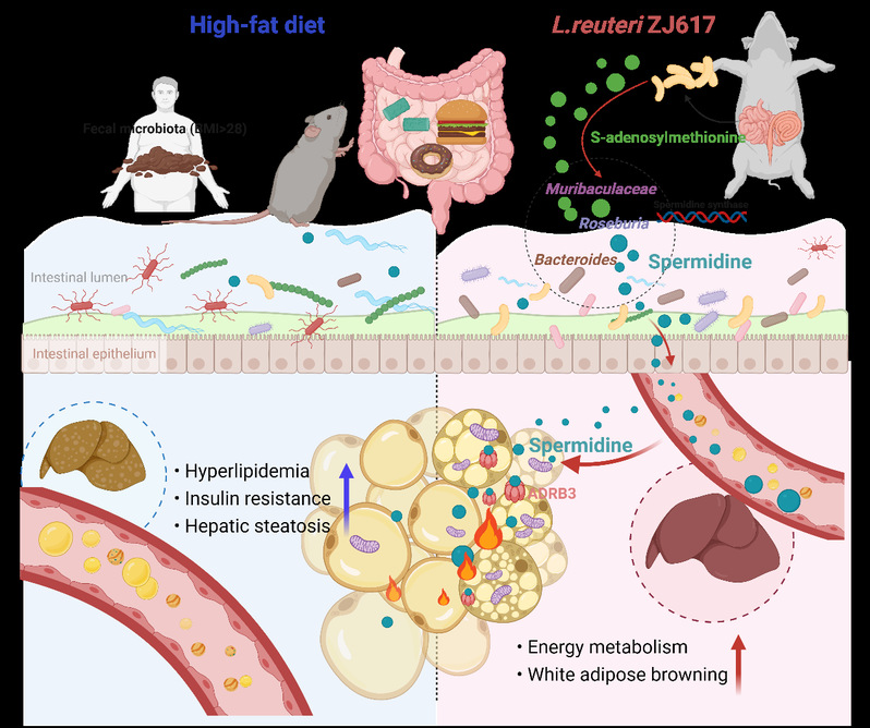 本研究发现,L. reuteri ZJ617能够缓解高脂饮食诱导的小鼠脂肪沉积,并具有提高机体能量代谢和促进白色脂肪棕色化的作用。肠道微生物组和代谢组分析发现L. reuteri ZJ617能够显著富集肠道中产多胺的微生物并提高肠道内容物及血清中亚精胺水平;通过粪菌移植确证L. reuteri ZJ617重塑的肠道微生物具有合成亚精胺的能力,并能够复现L. reuteri ZJ617的减脂作用。结合菌株的基因组信息和代谢特性,发现L. reuteri ZJ617菌株自身无法合成亚精胺,但具备为亚精胺合成提供前体物质S-腺苷甲硫氨酸(SAM)的能力。采用体外连续培养发酵系统模拟肠道微生态环境,验证了L. reuteri ZJ617通过生成SAM介导肠道产多胺微生物生成亚精胺的作用。小鼠补充亚精胺能够有效模拟L. reuteri ZJ617的减脂作用,而阻断体内肠道微生物亚精胺的合成途径则消除了L. reuteri ZJ617的代谢益处,证实亚精胺是L. reuteri ZJ617调控肥胖小鼠脂肪沉积的关键代谢物。最后,研究者发现L. reuteri ZJ617介导生成的微生物源亚精胺能够随循环系统到达脂肪细胞,提高脂肪组织亚精胺水平。脂肪细胞体外培养结合亚精胺干预进一步提供了其能够诱导脂肪细胞棕色化的证据。研究结果为利用罗伊氏乳酸杆菌调控机体脂质代谢提供了理论依据,同时为人类肥胖及其相关代谢性疾病的预防干预提供了新见解。