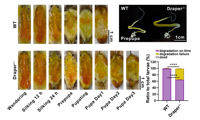 研究团队综合运用演化分析、免疫共沉淀、多组学及CRISPR介导的功能验证等方法,证实了Draper与ATG3的互作不仅对自噬过程具有正向调控作用,更在家蚕丝腺降解中扮演着关键角色。研究发现,Draper基因的缺失会显著延迟家蚕丝腺在变态期的降解过程,并抑制自噬活性的激活(图1);进一步的蛋白互作研究结果表明,Draper能够与ATG3结合,调控自噬过程,从而介导丝腺的组织重塑(图2)。