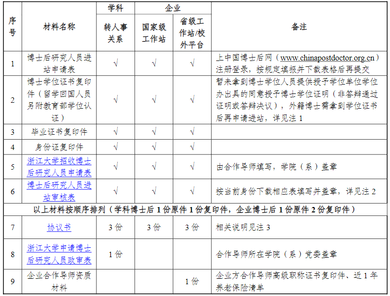 3.转人事关系及外籍人员签《浙江大学学科博士后研究人员聘用合同》、在职人员签《在职人员从事浙江大学博士后研究工作协议书》、国家级工作站联合招收签《浙江大学与博士后科研工作站单位联合招收企 业博士后研究人员协议书》、省级工作站联合招收签《浙江大学与浙江省博士后试点单位联合招收企业博 士后研究人员协议书》,校外平台联合招收签《浙江大学与校外平台联合培养博士后研究人员协议》,相 关协议从本网站表格下载栏下载。