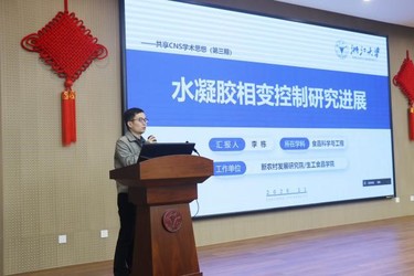 李栋作题为“水凝胶相变控制研究进展”的专题报告。他从研究背景、研究现状和研究亮点三个方面,系统介绍了研究团队在水凝胶极端温度耐受机制方面的突破性进展,相关研究成果已于2025年2月在《Science》期刊正式发表。研究团队突破传统水凝胶制备范式,提出了一种具有通用性的“水锁”策略,利用硫酸作为锁水剂,强化水和聚合物的结合,并引入牺牲网络避免主体网络结构塌缩,使水分子固定在凝胶聚合物网络中。
