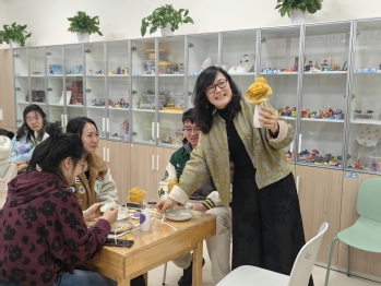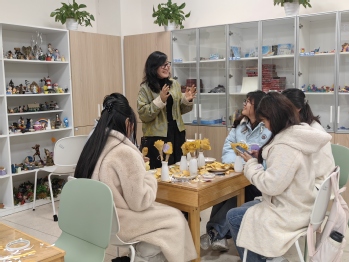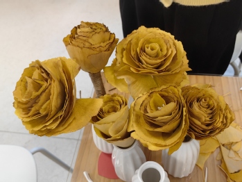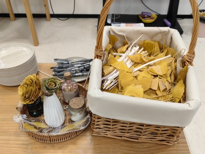 轻柔的音乐声中,孙老师从“植物疗愈力”出发,为我们讲述了自然创作的魅力,并为同学们演示了银杏玫瑰的制作方法。金黄的银杏叶、素雅的花瓶、齐全的工具,同学们细心挑选、轻轻叠放、逐一缠绕、稳妥固定……在孙老师细致入微的指导下,一朵朵姿态万千的“玫瑰”在同学们手中诞生!