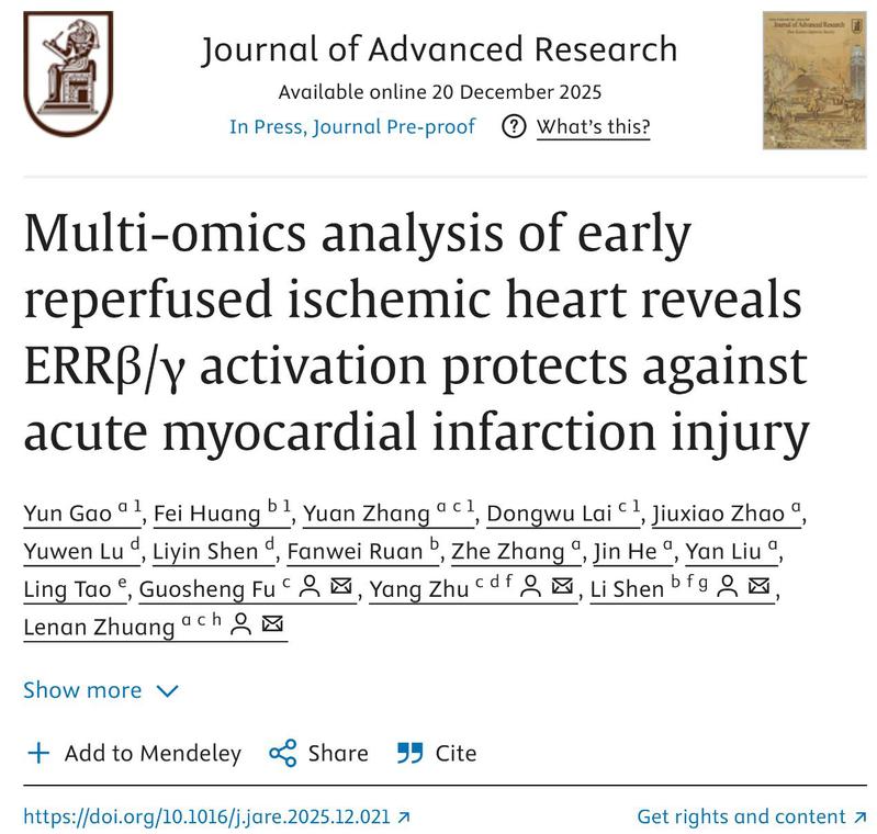 在全球范围内,急性心肌梗死(AMI)是人类心血管系统疾病死亡的主要原因之一,经皮冠状动脉介入治疗(PCI)作为恢复冠状动脉血流的标准疗法,其再灌注时机对限制梗死范围和临床预后至关重要。与晚期再灌注(LTR)相比,心梗后1小时内的早期再灌注(ETR)已被证实能够减少心律失常并提高生存率。然而,相较于LTR,ETR对AMI发挥保护作用的细胞和分子机制目前仍知之甚少。近日,浙江大学动物科学学院庄乐南研究员课题组在国际著名学术期刊《Journal of Advanced Research》上发表了题为“Multi-omics analysis of early reperfused ischemic heart reveals ERRβ/γ activation protects against acute myocardial infarction injury”的研究论文。