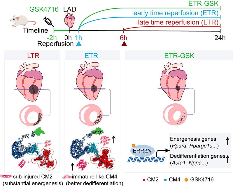 该研究通过整合多组学测序分析构建了不同时间点再灌注大鼠心脏的整合分子与细胞图谱,这种综合方法揭示了不同再灌注策略下细胞组成、转录调控及代谢状态的动态变化。研究数据表明:相较于LTR,ETR通过维持心肌能量生成并促进心肌细胞去分化实现心脏保护。单核转录组测序鉴定出四类心肌细胞亚群(CM1-CM4),其中ETR能更大程度保留亚损伤型CM2及未成熟样CM4亚群。机制层面,该研究筛选出ERRβ/γ机制层作为介导ETR保护效应的核心转录调控因子,并证实GSK4716激活ERRβ/γ可以通过上调与心肌细胞能量生成及去分化相关的基因,显著增强ETR介导的心脏保护作用。这些发现为时间依赖性的心肌挽救提供了新的见解,并提出激活ERRβ/γ作为急性心肌梗死中极具前景的治疗策略。