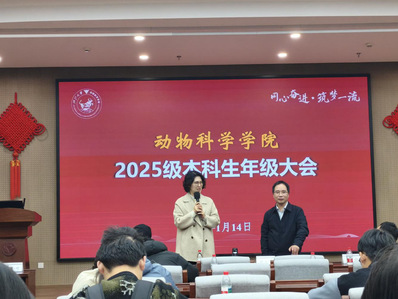 1月14日下午,动物科学学院2025级本科生年级大会在梓荣报告厅举行,学院领导、系所负责人、相关科室人员、班主任,2025级本科生和部分家长,共80余人参加。