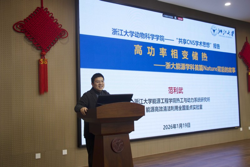 2026年1月19日上午,由学院主办的第4期“共享CNS学术思想”活动在梓荣报告厅(E122)举行。本次活动特邀浙江大学能源工程学院范利武教授作题为“高功率相变储热”的专题报告。学院副院长(主持工作)晏向华教授主持报告会,学校师生共计50余人参与了这场跨学科的学术思想交流。