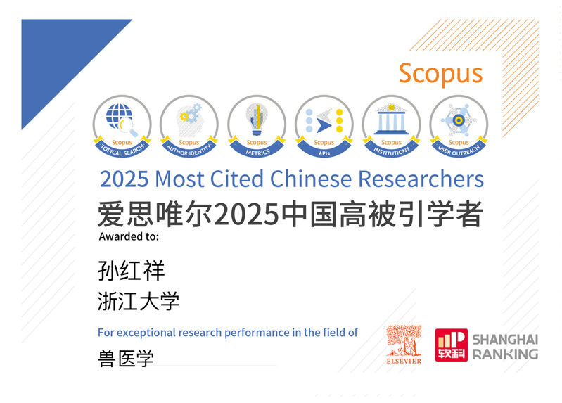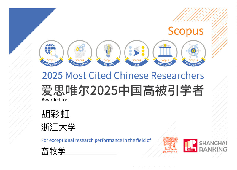 1月30日,爱思唯尔正式发布2025年“中国高被引学者”榜单。我院共有四位教授入选,他们分别是畜牧学领域的刘建新教授与胡彩虹教授、兽医学领域的孙红祥教授,以及生物学领域的彭金荣教授。