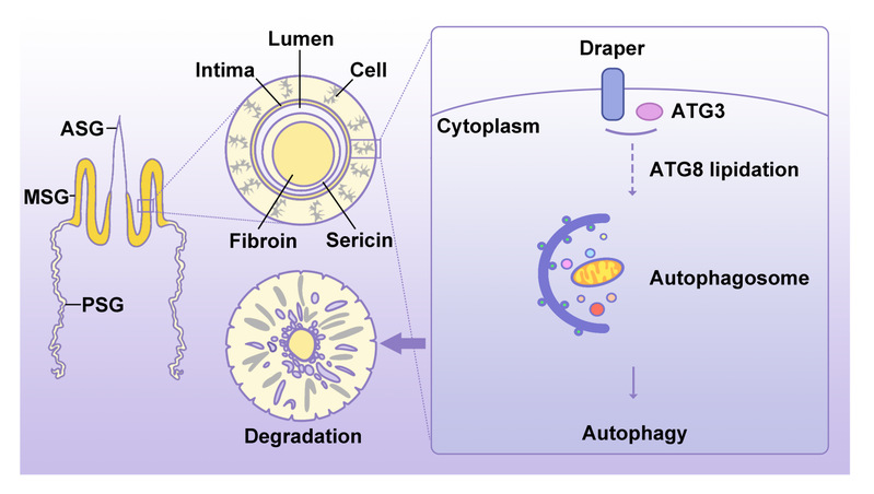 本研究揭示了受体蛋白Draper通过与自噬关键因子ATG3互作,调控家蚕丝腺的自噬进程,从而精确介导丝腺的时空特异性降解。该发现不仅确立了Draper在昆虫组织重塑中的重要调控功能,也为深入解析自噬分子机制与丝腺退化过程提供了新理论依据,并对未来通过遗传手段改良蚕丝性状具有重要的潜在应用价值。