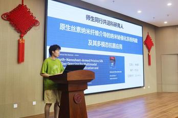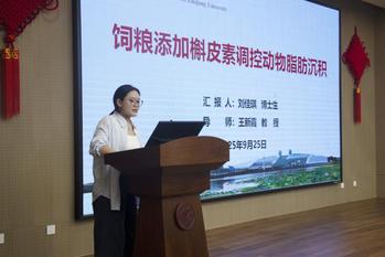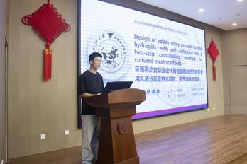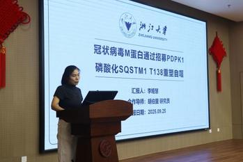 在学术分享环节,刘佳琪、裴聚鑫、余耀军和李娅慧依次分享了在《ADVANCED SCIENCE》《FOOD HYDROCOLLOIDS》《ADVANCED FIBER MATERIALS》《NATURE COMMUNICATIONS》等知名期刊上发表的研究成果,并作题为《饲粮添加槲皮素调控动物脂肪沉积》《采用两步交联法设计具有细胞黏附性的可食用乳清蛋白分离物水凝胶,用于培养肉支架》《原生丝素纳米纤维介导的纳米铋催化系统构建及其多模态抗菌应用》《冠状病毒M蛋白通过招募PDPK1磷酸化SQSTM1 T138重塑自噬》的学术报告,他们从研究背景与意义、研究内容、研究总结及未来展望等方面展开汇报,报告内容翔实、逻辑清晰,体现出严谨的学术功底和蓬勃的创新活力,充分彰显了我院优秀的育人成果。